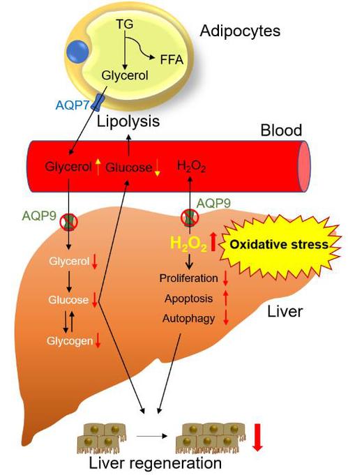 肝再生是一个复杂而精密的组织再生过程,涉及多种细胞因子、生长因子和代谢信号的调控。在哺乳动物中,AQP9是一种定位于肝细胞面向血窦侧质膜的水-甘油通道蛋白,具有高效转运水、甘油、过氧化氢和其他一系列中性小分子溶质的作用。该研究发现,肝大部切除后,AQP9通过促进肝细胞内过量过氧化氢的外排降低氧化应激水平,同时增加肝细胞摄取甘油促进糖异生,进而有助于肝大部切除后的肝细胞增殖,减轻肝细胞氧化应激损伤。AQP9敲除鼠经AAV病毒介导回补水-甘油通道AQP9和AQP3能够拯救肝脏再生障碍表型,而回补严格转运水的通道AQP4无拯救作用,说明AQP9的转水功能在肝再生中不起关键作用。该发现为肝切除手术或肝部分移植后的肝再生提供了新的干预靶点。