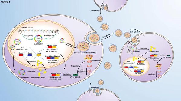 杨烨、顾春艳教授课题组在Journal of Experimental & Clinical Cancer Research期刊在线发表题为“A novel protein encoded by circHNRNPU promotes multiple myeloma progression by regulating the bone marrow microenvironment and alternative splicing”的论文。目前困扰MM的难题是其不可治愈性以及复发耐药性,其中免疫球蛋白D型MM(IgD MM)是最为恶性的亚型之一。IgD MM最显著的特点是难治且预后差,总生存期仅13~21个月。目前,环状RNA(circRNAs)具有功能强大、作用广泛、稳定性强等特点,被认为是癌症诊断、治疗以及预后判断的生物标志物之一。因此,系统性研究IgD MM中的circRNAs,对IgD MM及其他复发难治型MM都具有指导意义。该研究综合运用Agilent SBC-ceRNA 基因芯片、BaseScopeTM RNA ISH、蛋白组学以及RIP-seq等技术,筛选并鉴定了IgD MM患者中高表达的致癌环状RNA circHNRNPU。机制研究创新性地揭示了circHNRNPU编码603个氨基酸的新型蛋白circHNRNPU_603aa,该蛋白通过外泌体的形式被分泌到骨髓微环境中调控SKP2外显子跳跃,从而竞争性抑制c-Myc泛素化,稳定c-Myc,促进MM细胞恶性增殖。该研究为IgD MM的早期预警、客观诊断和预后评估提供可靠的生物学标志物,也为IgD MM以及其他复发难治MM患者的治疗提供新的理论与实验依据。博士生唐校柱为该论文第一作者,博士生邓振东和丁平刚为共同第一作者,顾春艳教授、杨烨教授和杜鹃教授为共同通讯作者。该研究获得国家重点研发计划(2020YFA0509400)、江苏省优秀青年科学基金项目(BK20200097)、国家自然科学基金(81870164、81372543)、江苏省高等公司重点学科发展(中西医结合)基金、江苏省研究生科研创新计划项目(KYCX20_1479、KYCX21_1746)等项目资助。