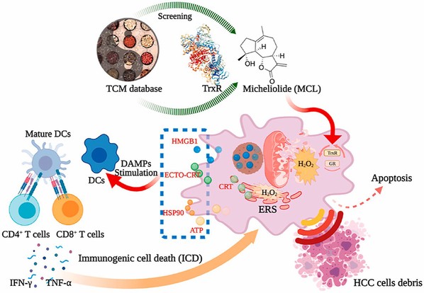 该工作以硫氧还蛋白还原酶(Thioredoxin reductase, TrxR)蛋白为靶点,从中药单体化合物库中,成功筛选出潜在的TrxR抑制剂倍半萜内酯类的中药单体含笑内酯(Mecheliolide, MCL);MCL能与TrxR表面暴露的活性位点Sec498和Cys497发生不可逆的共价结合,选择性抑制肝癌细胞中的TrxR活性,刺激ROS水平的激增,破坏肝癌内的氧化还原稳态,诱导ERS的发生;通过过氧化氢感受器Hyper7 ,系统性分析了MCL介导后肝癌细胞内的过氧化氢生成情况;MCL能通过ROS介导的ERS,进一步引起DAMPs的释放,引起肝癌细胞免疫原性细胞死亡(ICD)。