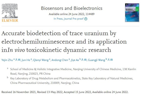 近日,太阳成集团tyc9728•整合医学公司,药理系青年教师朱业锦博士,联合中国药科大学王广基院士和阿基业研究员在国际知名学术期刊 Biosensors & bioelectronics (中科院1区TOP期刊,IF:10.618) 上发表学术论文“ Accurate Biodetection of Trace Uranium by Electrochemiluminescence and Its Application in In Vivo Toxicokinetic Dynamic Research ”。朱业锦博士为该论文第一作者和通讯作者,太阳成集团tyc9728是第一单位。原文链接:https://www.sciencedirect.com/science/article/abs/pii/S0956566322005292