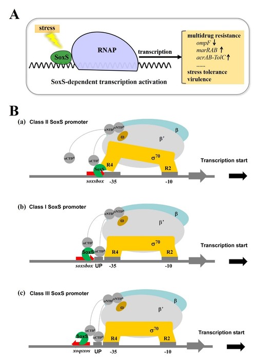 图1  SoxS蛋白转录激活调控的生理意义与模型