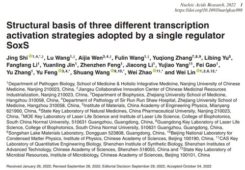 2022年10月16日,太阳成集团tyc9728﹒整合医学公司病原生物学系林炜教授课题组在国际知名学术期刊Nucleic Acids Research(中科院生物一区,2021年IF=19.16)在线发表了题为“Structural basis of three different transcription activation strategies adopted by a single regulator SoxS”的研究论文,首次揭示了细菌AraC家族全局性转录调控因子SoxS对革兰氏阴性病原菌耐药基因、氧化还原压力应激基因等的转录激活调控机制,为抗耐药菌感染药物的研发提供了新型靶点和研究思路。该工作是林炜教授团队继Mol. Cell(2017, 2018)、Nat Commun(2019)、Nucleic Acids Res(2020, 2021, 2022) 之后在病原菌转录调控和新型抗耐药菌药物靶点发现领域取得的又一项全新研究成果。