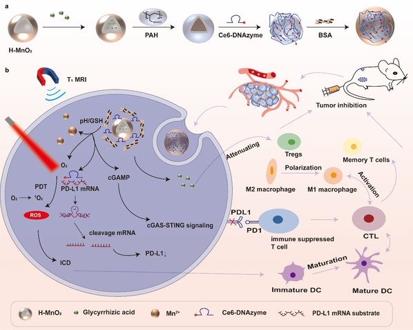 通过构建二氧化锰纳米载体,使得中药单体GA和基因治疗工具Ce6-DNAzyme的靶向递送成为可能。这种pH/谷胱甘肽响应负载GA和Ce6-DNAzyme的二氧化锰纳米平台可用于联合基因治疗和免疫治疗。MnO2纳米粒子可高效递送脱氧核酶和甘草酸,增强肿瘤靶向效应。在肿瘤微环境中,MnO2的生物降解促进了GA和Ce6-DNAzyme在肿瘤部位的释放,光敏剂Ce6和GA可产生活性氧促进免疫原性细胞死亡(ICD),而 Mn2+的产生催化DNAzyme切割活性的同时还可作为cGAS-STING通路的激活剂,实现多重免疫的疗效,相关免疫因子的检测也显示出了其免疫调节的巨大潜能。
