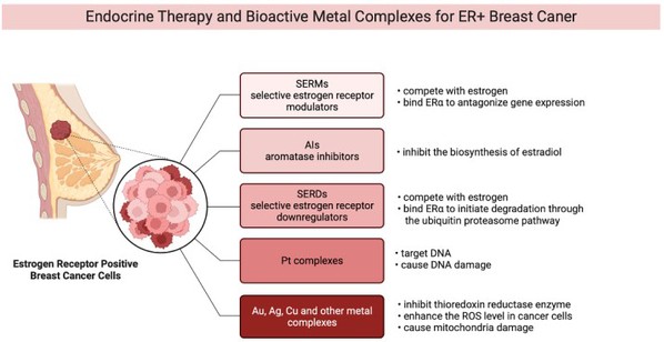 课题组近期以Perspective的形式在药物化学权威期刊《Journal of Medicinal Chemistry》发表了题为“Research Progress on Bioactive Metal Complexes against ER-Positive Advanced Breast Cancer”的最新研究成果。乳腺癌是影响女性健康的重大疾病,内分泌治疗是当下雌激素受体阳性乳腺癌的主要治疗方法,但是复发和耐药是内分泌治疗的主要问题。金属化合物,如顺铂等在临床上显示了很好的抗肿瘤效果,在此论文中,作者详细总结了自2000年以来针对雌激素受体阳性乳腺癌的金属化合物的研究情况,描述了如铂,金,铜等金属化合物抗乳腺癌研究,并对未来的发展、机遇和方向提出了展望。硕士研究生梁震林为该论文的第一作者,刘武昆和青年教师路云龙为该论文的通讯作者。