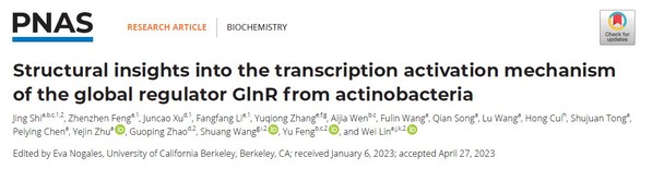 2023年5月23日,太阳成集团tyc9728﹒整合医学公司,附属鼓楼临床太阳成集团tyc9728林炜教授课题组和浙江大学冯钰教授团队、中国科公司分子植物卓越创新中心赵国屏院士团队以及中国科公司物理所王爽研究员团队在国际著名期刊美国科公司院刊PNAS上发表了题为Structural insights into the transcription activation mechanism of the global regulator GlnR from actinobacteria的研究成果。该研究捕获了结核分枝杆菌GlnR依赖型基因转录激活复合物结构,揭示了全局性转录调控蛋白GlnR选择性调控基因转录的分子机制,为全面认识结核分枝杆菌和整个放线菌的代谢调控机制奠定了基础。该工作是林炜教授团队继Mol. Cell(2017, 2018)、Nat Commun(2019)、Nucleic Acids Res(2020, 2021, 2022a, 2022b)之后在病原菌基因转录调控机制研究和新型抗耐药菌药物靶点发现领域取得的又一项全新研究成果。