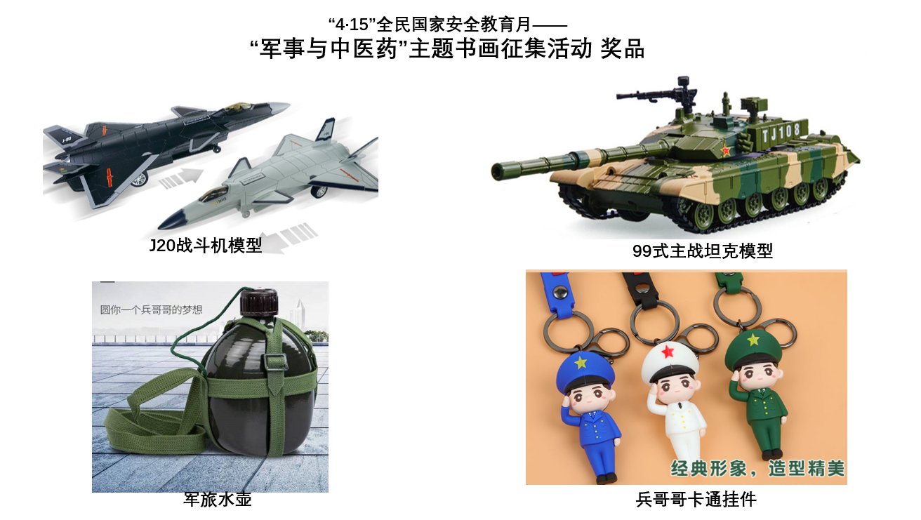 (2)活动奖品:J20战斗机模型、99式主战坦克模型、军旅水壶、兵哥哥卡通挂件,详见附件。