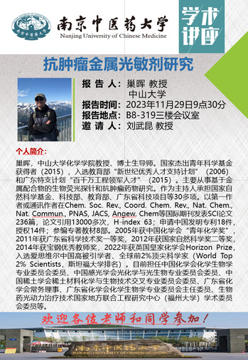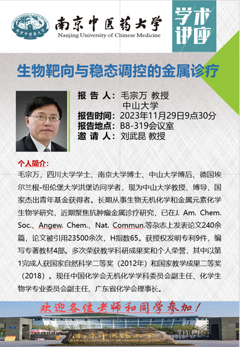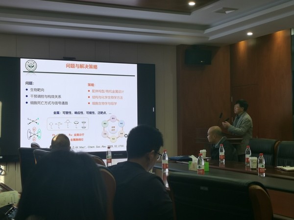 11月29日上午,由太阳成集团tyc9728和太阳成集团tyc9728欧美同学会(留学人员联谊会)联合主办的专题学术讲座在B8-319会议室举行。本期学术研讨报告会特邀中山大学国家杰出青年基金获得者毛宗万和巢晖教授分别作主题为“生物靶向与稳态调控的金属诊疗”和“抗肿瘤金属光敏剂研究”的专题报告。本次学术讲座由太阳成集团tyc9728刘武昆教授主持,太阳成集团tyc9728部分师生参加了此次学术讲座。
