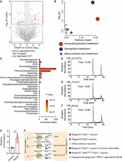 TRPV1感受伤害性热、酸和辣椒素刺激,是痛觉信号传导门控分子;MrgprA3+神经元是痒觉特异性神经元。在此项研究中,研究人员结合基因打靶和化学遗传学技术实现在MrgprA3+神经元中特异性激动或者抑制TRPV1,揭示了慢性痒条件下TRPV1编码痒觉信号传导的新途径;研究人员进一步结合非靶向代谢组学技术从慢性痒患者和模型小鼠皮肤中筛选出TRPV1的内源性激动剂20-HETE,并且发现抑制20-HETE合成有效缓解慢性痒模型诱导的痒觉行为和皮肤炎症。TRPV1属于热敏离子通道,是一些温热性中药活性成分的作用靶点,本研究揭示了痛觉感受器TRPV1编码痒觉信号传导的新机制,为探索中医药止痒的生物学机制提供了新的潜在靶点。