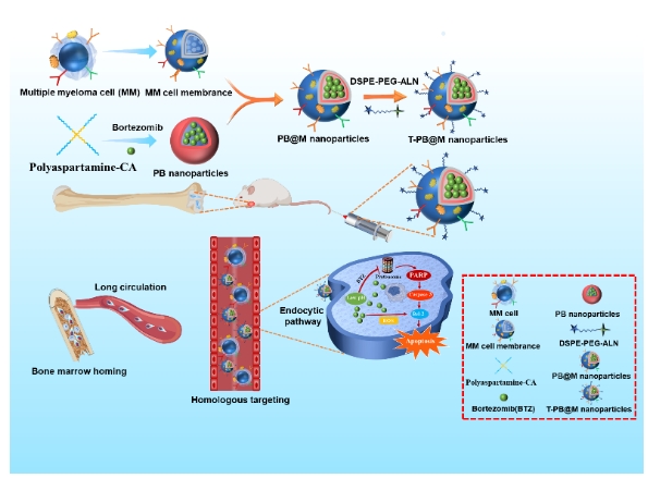 多发性骨髓瘤(Multiple myeloma,MM)是第二大常见的血液恶性肿瘤。骨骼系统的物理屏障阻碍化疗药物进入肿瘤组织,增加了化疗药物对周围组织和器官的毒副作用,给临床治疗带来了严峻挑战。该研究团队研发出基于肉桂酸及化疗药物硼替佐米的双靶向工程仿生纳米粒子,能够突破骨骼物理屏障,实现化疗药物硼替佐米在主要MM部位高浓度维持。此外,该纳米粒子的药物释放由肿瘤微环境低pH值触发,诱导MM细胞发生凋亡,研究深入揭示了纳米结构中肉桂酸在化疗过程中与生物体内成分结合后所经历的命运变化,展现了较强的临床应用潜力。