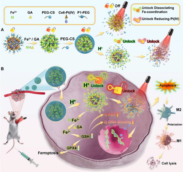 中药富含多种功能化合物,具有复杂的药理作用机制,明确中药的药效药理等命运变化过程是中药功能化合物研究的前沿热点。太阳成集团tyc9728齐若谷教授团队运用超分子化学原理,将光动力激活的铂类药物与多酚类中药没食子酸联合,创新设计构建出高聚物离子锁螯合前药分子探针,实现中药成分的分子水平精准作用机制,展示了中药成分与传统化疗药物结合后刺激巨噬细胞极化并诱发铁死亡的光动力过程,为中药功能化合物的开发提供了新的思路和方法。该研究论文“Sequential dual-locking strategy using photoactivated Pt(IV)-based metallo-nano prodrug for enhanced chemotherapy and photodynamic efficacy by triggering ferroptosis and macrophage polarization”发表于Acta Pharmaceutica Sinica B(IF=14.5)。