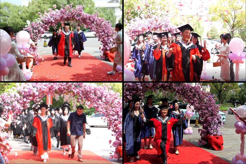 丰盛健康楼广场前,红毯穿过鲜花拱门向会场展开,师门红毯仪式热烈启幕。欢乐的乐章奏响,毕业生们身穿学位服,与恩师、同窗携手踏上红毯。在鲜花、礼炮和气球的烘托下,师恩的厚重、友情的真挚、离别的祝福和同学们对南中医的眷恋展现得淋漓尽致。