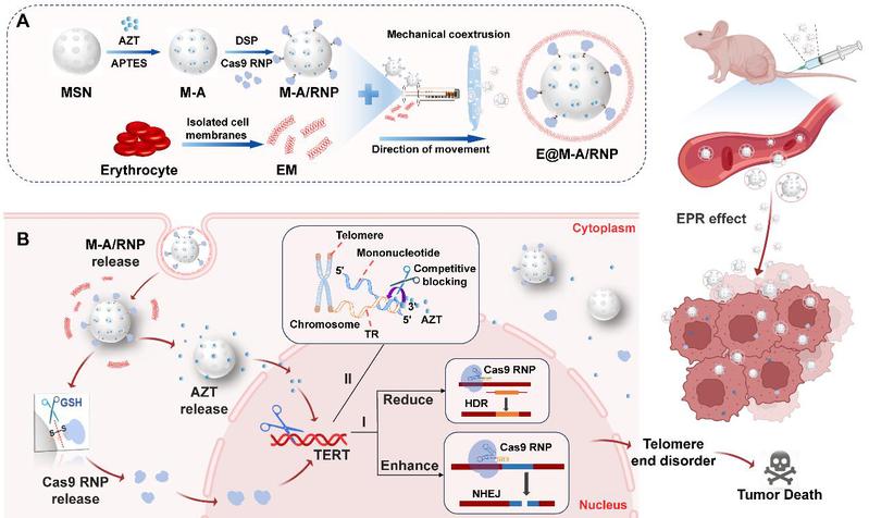CRISPR-Cas9体系已成为通过非同源末端连接(NHEJ)进行序列特异性基因敲除的有效工具,然而低效的基因组序列精准编辑仍然是临床治疗的一大挑战。研究团队还探究了提高CRISPR-Cas9体系基因编辑能力的新策略,构建了一种利用药物协同作用来增强CRISPR-Cas9基因编辑效果,该生物仿生膜伪装纳米系统在高生物安全性下增强Cas9 RNP基因编辑效率,并通过引发端粒末端紊乱来促进肿瘤细胞衰老,达到抗肿瘤治疗的目的。研究论文“Erythrocyte membrane-camouflaged nanodelivery strategy enhances gene editing efficiency of Cas9 RNP for boosting tumor senescence”发表于Chemical Engineering Journal(中科院一区Top,IF: 13.3)。硕士研究生史思林、青年教师陈超和硕士研究生沈雪婷为共同第一作者,韩欣教授、唐梦帆教授和青年教师陈超为共同通讯作者。
