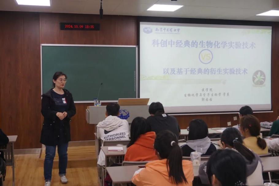 郭老师把讲座内容分为两部分,将“科创中经典的生物化学实验技术”和“基于经典的衍生实验技术”做比较。她热忱地关心同学们对实验技能的了解程度,仔细讲解未来学业中要完成的实验内容,并介绍了老员工创新创业训练计划,分享了自己带领员工开展科创活动的经验心得。