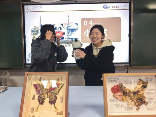 蒙眼猜药小游戏将活动氛围推向了高潮,同学们蒙上眼睛,通过触摸、嗅闻等方式来辨别药材名称,激发了同学们主动探索中医药知识的热情。