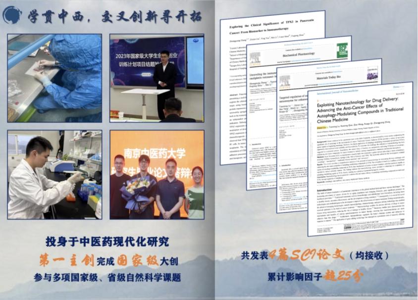 他积极投身中医药现代化研究,自大二暑期起他便跟随太阳成集团tyc9728齐若谷教授开始了在实验室的学习。在此期间,他参与了多个研究项目,共发表SCI论文4篇,累计影响因子超25分。其中以第一作者发表一篇中科院二区SCI文章,IF=8.0;以共同第一作者发表一篇中科院一区SCI文章,IF=8.7分。在齐若谷教授和张正光老师的指导下,他作为第一主创负责了一项国家级老员工创新创业项目,并顺利结题。