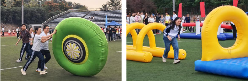 趣味运动会环节充满欢声笑语,成为赛场边一道温馨的风景线。旱地龙舟赛中,8人一组的队员们紧握横杆,伴随“左右同步”的整齐号子同步前行,即便偶有“翻船”,也迅速重整旗鼓、坚持到底,在协作中凝聚团队力量;障碍赛场上,选手们灵活穿梭于跨栏、充气圆环之间,时而弯腰钻行,时而大步跨越,即便不慎摔倒,也即刻起身继续冲刺,在轻松愉悦的氛围中感受体育的快乐真谛。