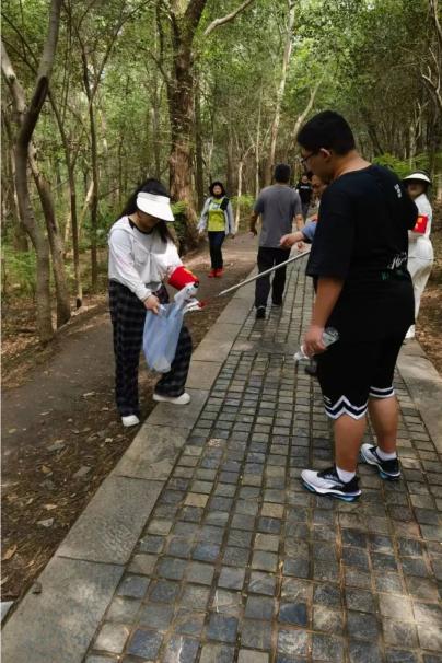 在南京文保大队副队长王强老师的专业带领下,志愿者们沿着登山步道,化身“环保卫士”,手持垃圾袋与夹子,仔细捡拾沿途的烟头、塑料瓶、纸巾等垃圾,不放过任何一处卫生死角。尽管当日十分炎热,爬山的途中大家都大汗淋漓,但看到干净的路面,大家的脸上都洋溢着满足与喜悦。