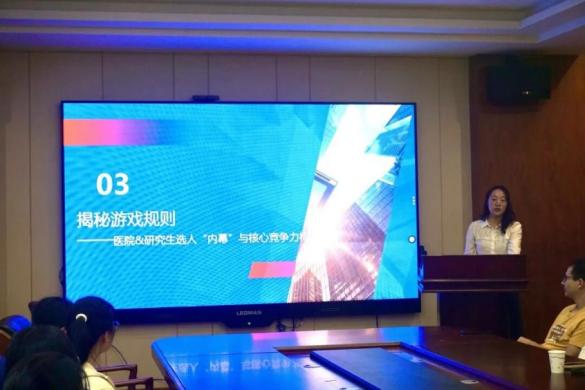 陈老师与杨老师从数据的角度分析了当前高校毕业生的就业现状,并以江苏省中医院为例详解了医疗行业招聘政策与要求。在此基础上,又就如何进行职业生涯规划,具体的医院面试注意事项,考研规划以及简历黄金法则进行了讲解。