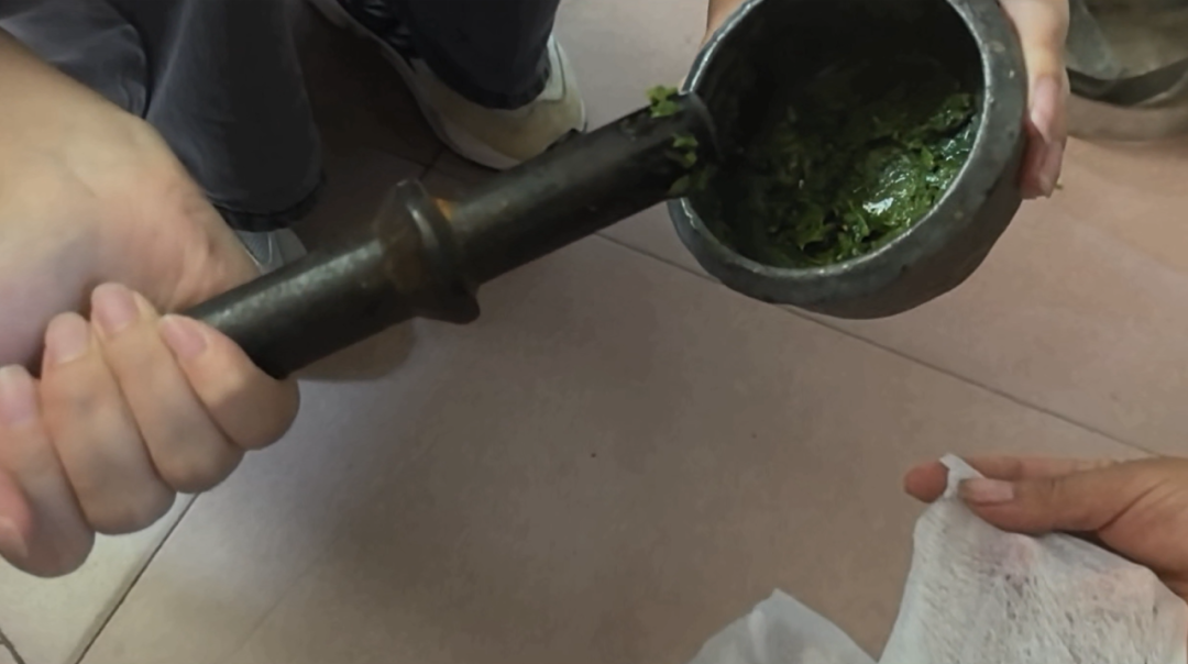 世代依山而居、临水而作的布依人,将草木的灵性融入生命的守护。人们采集透骨香、血藤、艾草等多种山野药材,经煎煮后制成温热的药液进行浸泡,用以舒筋活络、祛风除湿、缓解劳损。药材加工则保留着传统方式——新鲜或晒干的草药常在石臼中反复舂捣,用于外敷、内服,或配制其他药剂。
